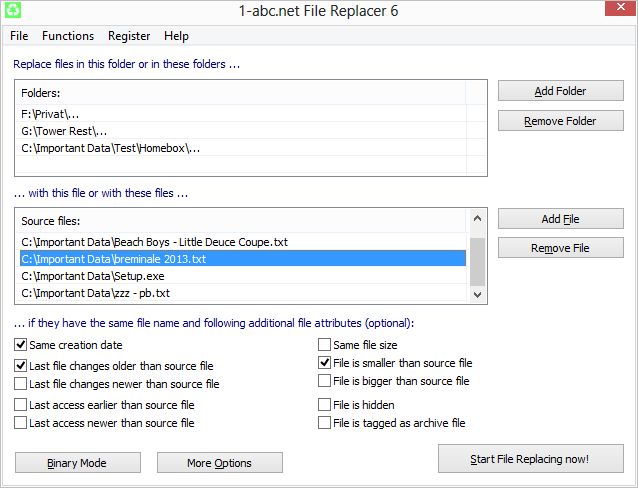 1-abc.net File Replacer - Version 5.00 The Windows-integrated file manager called Windows Explorer offers multiple options to cut, to copy and to paste files. Anyway, whenever you try to overwrite single files that are located in many different folders you first have to find them by your own and then paste a source file you copied before. This can take much time, and since the number of files on big hard drives grows all the time, most Windows users are not able to manage their file system good enough to do such replacements correctly. In the end documents, images, songs and videos with the same or similar content in different versions are spread all over your hard drive and even you by yourself will not know where the right one is, or the biggest one or the latest one. 1-abc.net File Replacer helps you to update your whole hard drive, USB stick, camera card or network. You add a path or paths where the program should check for possible replacements, you add a source file or source files and then you determine by your own when such a batch replacing shall be done. Besides same file names you can define such files as