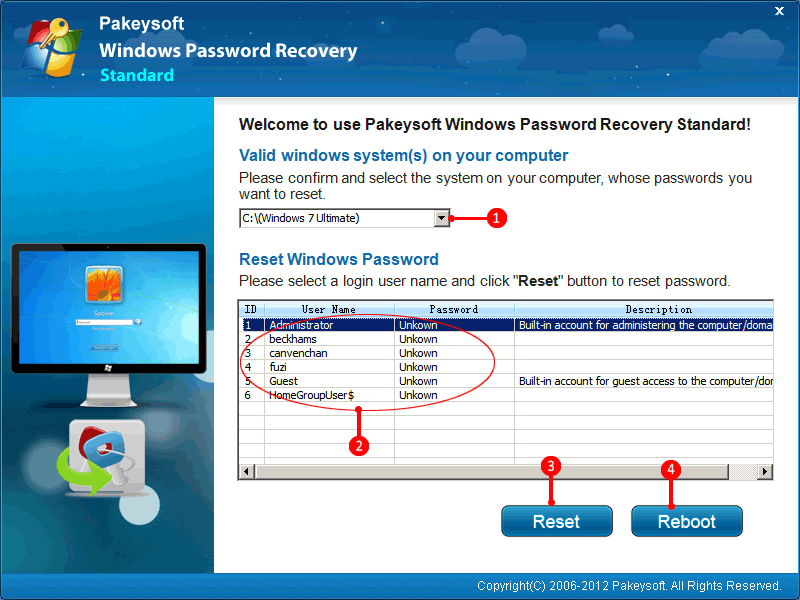 Bypass Windows 7 Login Password - Version 4.0.1 How to Bypass Windows 7 Password now can be solve using Pakeysoft Windows 7 Password Reset Tool that recover passwrow of any Windows 7 OS easily. Windows 7 Password Reset tool assigns a new password with getting assistance of user, which is becomes the running password. Windows 7 password is the best feature of Windows 7 security and after that if you forget or have losing your password it is the worst part of it. If you lose your Windows 7 password and urgently need to again your system . Windows 7 Password Recovery can be a rescuer for such times and helps in Password Recovery for Windows 7 application and Bypass Windows 7 Password protected Windows 7 systen. Software successfully runs on Windows OS like: Windows 7, Vista, XP, 2008, 2003 and 2000 etc. Download the DEMO version of Password Recovery and remove query How to Bypass Windows 7 Password with this tool free of cost. The demo version shows the user name of your windows 7 operate system. After evaluation of the demo version, if you satisfied then you may purchase the full version in just $19 for the