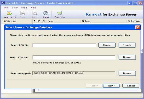 Exchange Database Repair - Version 10.10.01 Exchange database recovery can be now performed easilyusing competent Recover Exchange Recovery softwarecalled Kernel for Exchange Server Recovery. Entire lostemails, attachments, drafts, deleted emails, journals,contacts etc. from the EDB file can be retrieved injust few clicks. Priv1.edb, Dir.edb files and otherExchange database files are recovered successfully.Embedded with 3 powerful recovery modes make thisExchange database recovery success and fruitful as well. This EDB repair tool enables user to recover ExchangeServer in case of server downtime, improper Exchangeshutdown, JET engine errors, power issues, virusattacks, corrupt headers, drive errors. This Exchangerecovery software function can be summarized into threesteps: rebuilds EDB database with recovered data,restores deleted emails and saves recovered items toPST file. Exchange Database Recovery tool is availablewith free demo version as well, which is fullyfunctional and recovers Exchange EDB database file.User can save the recovered result after purchasing thefull version of the tool. Exchange Database Recoverysoftware supports MS Exchange Server 5.0, 5.5, 2000,2003, 2007 and 2010 and MS Outlook 2010, 2007, 2003,2000, 98 & 97.