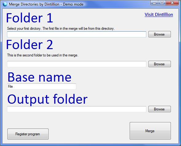 Merge Directories - Version 1.0.0 This utility allows you to merge directories. This can come in handy if you have the front and back sides of a document in separate folders and wish to combine them. The demo version restricts merging to ten files only. If you like the program, please register at www.dintillion.com.