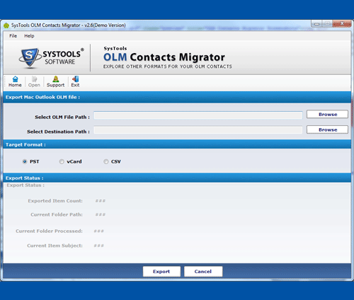 Migrate OLM Address Book to VCF file - Version 2.7 Migrate OLM Address Book to VCF and other 2 formats that is PST and CSV without any supervision using OLM Contacts Migrator. No tweaks required to run this software on Windows Any version. Broadly used software is available with Demo Copy and Full License version. Only difference is that Demo Migrate OLM Address Book to VCF, PST, CSV for first 15 Contacts and Full version at $69 offers Conversion of OLM Address Book for MULTIPLE OLM files. It can migrate OLM Address Book to VCF file i.e vCard which can be easily imported in the portable devices like iPhones, iPads, Blackberry Handsets or other vCard supported devices. Thus we recommend you to must give it a shot and after the successful trial purchase the same to Migrate OLM Address Book to VCF file format. Our software runs successfully on all the versions of Windows Operating Systems, so no need to worry only you have to do is, Export OLM files from the Mac Outlook 2011, for it you can go through the Guidelines to Export OLM files. And after successful exportation you will have to carry the .OLM file into the Windows
