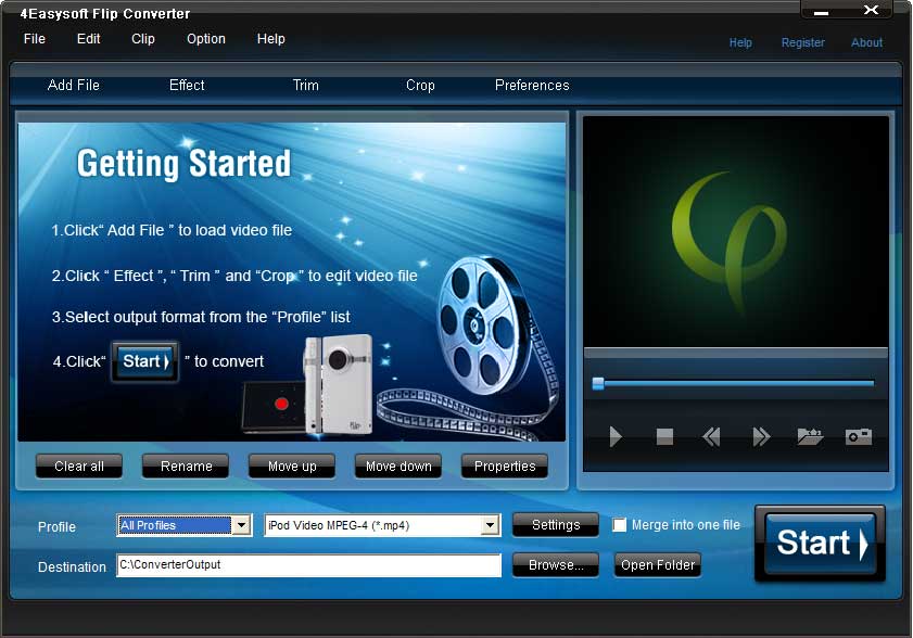 4Easysoft Flip Converter - Version 3.3.36 4Easysoft Flip Converter is designed to convert Flip video created by any Flip series to any other video/audio formats like MOV, M4V, AVI, 3GP, FLV, HD video and AAC, MP3, OGG, WMA, etc for any players. It also possesses more powerful editing functions of effect, trim, crop for you to recreate your video: adjust output video effect, capture any time-length clips and crop video play region and add watermark on your video, etc.