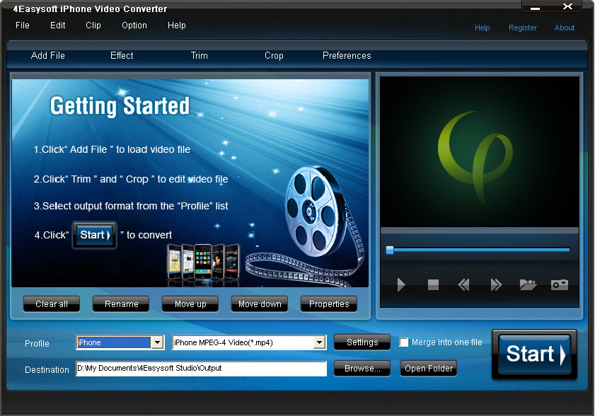 4Easysoft iPhone Video Converter - Version 4.2.02 4Easysoft iPhone Video Converter is a superior video to iPhone converter, which can convert video to iPhone such as MPEG, VOB, MP4, M4V, QuickTime MOV, etc for iPhone and convert AVI to MP3, AAC, M4A for iPhone. Also, 4Easysoft iPhone Video Converter can convert video to iPhone and put movie on iPhone. Besides, it also provides you with some editing functions like: video cropping, movie effecting, movie trimming, etc.