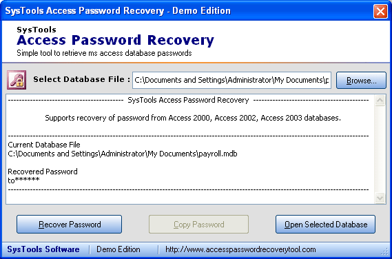 Access Password Recovery Professional Tool - Version 5.2 Recover Access Password process can be successfully completed within small steps with SysTools Access Password Recovery program is the best utility to recover your all MS Access password very easily. Access Password Recovery Professional Tool is the advance software to all access recovering software and you can purchase Advanced Access password recovery tool at affordable price. You can recover your access password very easily with the help of online Access Password Recovery Tool. Access Password Recovery professional Tool uses advanced algorithm to scan password protected.mdb file and recover the original password instantly. If you forget your access password or lose your mdb password and could not access your access database, you can easily get your access password back by using mdb password recovery software. SysTools provided a great online Access password recovery tool which is perfect utility to get back data. Using this software you can easily recover or unlock MDB password. Access password recovery professional tool has easy and user friendly interface