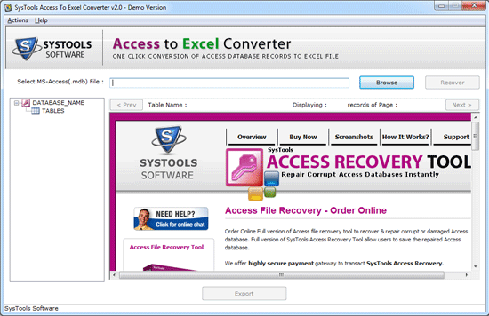 Access to Excel Converter Tool - Version 2.0 Recover Access database or recover corrupt MDB file using Access to Excel converter tool. Convert Access file or convert Access MDB to Excel XLS file format with MDB to XLS conversion program as software simply perform Access MDB to Excel XLS conversion process. Access to Excel converter tool is simple and easy user interface for Access MDB recovery and conversion from MDB (Access) to XLS (Excel). Software can convert corrupted MDB (Access) to healthy XLS (Excel) files. Download trial version (that is free of cost) of Access to Excel converter tool to preview the converted contacts only, you cannot save MDB files to Excel file format. Get full retail version of Access to Excel converter tool that can convert and save multiple MDB files into XLS file format at only 29 USD.