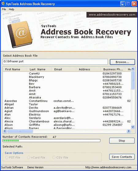 Address Book Recovery - Version 2.0 In Address book users stores all their frequently used email addresses, which enable them to select from the list of contacts instead of having re-typing the addresses each time they send an email. When Address Book gets corrupted all the contacts stored in it become inaccessible. Address Book Recovery tool help to Recover Contacts. Repair Address Book recovers corrupt & damaged address book of Microsoft Outlook (.PST), Outlook Express (.WAB), Exchange Server (.OST), Lotus Notes (Names.NSF) & Incredimail (.IMB). Address Book Recovery tool works smoothly with Windows 98, Windows ME, Windows 2000, Windows 2003, Windows XP, Windows Vista & Windows 7. Address Book Recovery Software perform the function of both the recovery & conversion, WAB Recovery allows users to save the recovered contacts of MS Outlook / Exchange, Outlook Express, Lotus Notes & Incredimail to .vcf, .csv & .pst file format. Repair Address Book tool also allows users to restore accidentally deleted contacts from corrupted Windows Address Book, MS Outlook or MS Exchange contacts. Try the demo version of WAB