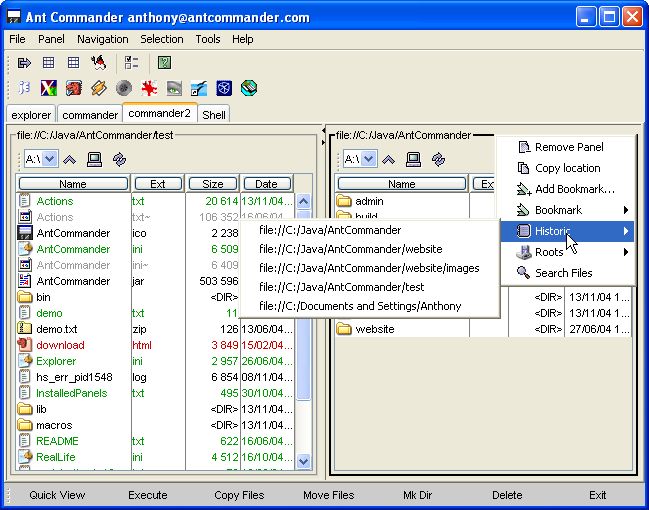 Ant Commander - Version 1.2 Ant Commander is a fully configurable file manager. Several file systems are suported: file, zip, ftp, webdav, etc. Several kinds of panels are available: directory table; directory tree, text editor, image viewer, html viewer, command line, etc. You can configure the menu, the toolbars, the panels, the actions, etc. And more: skinnable, OS independant, bookmarks, historic, external plug-ins, a lot of file operations, etc.