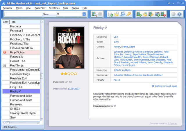 Best Movie Manager - Version 6.0 Forget about the problems with your movie collection if you use movie manager for organizing your 3000+ movie collection! It solves all your problems hands down leaving you plenty of free time! As soon as you get acquainted with the movie manager, you'll see how easy it is to use it and realize in practice what "user-friendly interface" means. Many ways to add a movie to the collection and lots of online databases to pick up info from are superb!