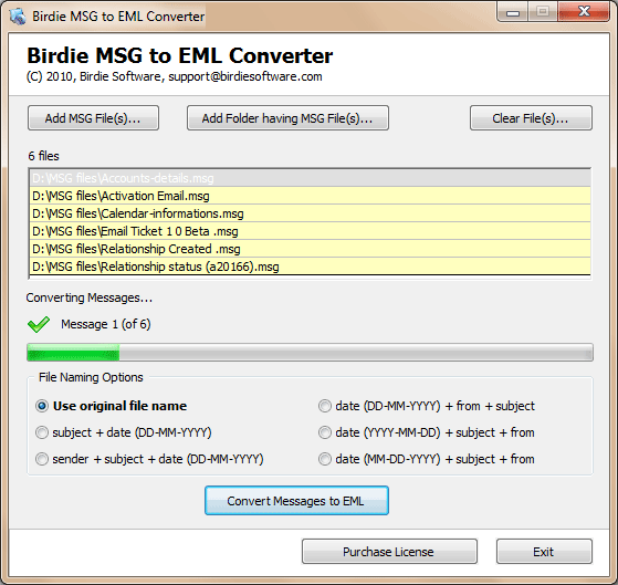 Birdie MSG to EML Converter - Version 2.7 Need a solution to shift your Outlook Email Messages (.msg file) into EML format, so that you can read, open or view your MSG emails into Windows Mail or Windows Live Mail? To do this task in a right way you definitely need an email conversion solution to convert MSG to EML format. So get the highly advanced, smart, elegant, professional, HOT Birdie MSG to EML Converter, this will helps you to convert your Outlook MSG messages into EML file in easy and quick manner. With the help of our MSG file converter you can preserve the original file name, subject, date, sender information, from data and many more properties of Outlook messages in the EML files throughout the email conversion process. This program also helps users to convert batch EML files to MSG format in some few simple clicks as this software perfectly work as MSG to EML batch converter solution. You can save all the attachments along with EML of MSG file by using MSG to EML conversion utility. It has very handy user interface so that no voice can use it and this is available for all Windows users as it works smoothly