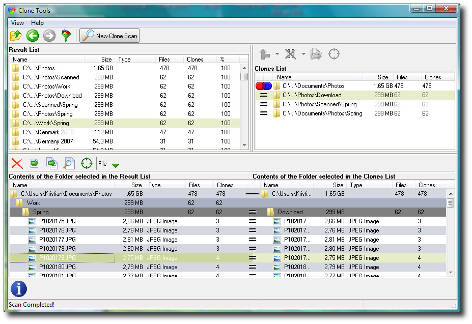 Clone Tools Duplicate File Finder - Version 2.00 Find and Delete Duplicate Files and Folders.Clone Tools is the first duplicate file finder that finds folders with shared or identical content. The birds-eye view offered by Clone Tools unique side by side browser and powerful automatic folder level tools lets you find and remove duplicate files fast without losing control.Get your files organized: Redundant copies of files does not only waste hard drive space but also makes your computer disorganized. Download Clone Tools and start organizing your files and delete duplicate content.Safe to use:Clone Tools uses a byte by byte scan on all possible duplicate files, this is the only way to know for sure that the files are identical. Windows system folders are excluded from the scan by default.