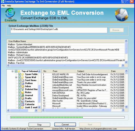 EDB to EML Conversion - Version 1.0 Microsoft Exchange Server to .EML Conversion is an absolute solution for EDB to EML Conversion tool launched by Enstella Systems as it is made as per user feedback. Enstella Exchange to EML Converter effectively & safely converts EDB to EML with attachment. Convert EDB to EML software provides great functionality to convert single or multiple EDB Mailbox to EML format on reasonable price $229. With Enstella Exchange to EML Migration tool, you can easily export Exchange emails to Outlook Express and Thunderbird email client.Enstella EDB to EML Conversion tool has latest email migration techniques & advanced algorithms that the software can export encrypted Exchange .EDB emails also. Export EDB to EML software easily convert EDB emails, attachment, Inbox, Outbox, Sent Items, Deleted Items, Drafts & all user created folders & sub-folders of Exchange Server to EML successfully.Switching Exchange Server mails to Outlook Express &