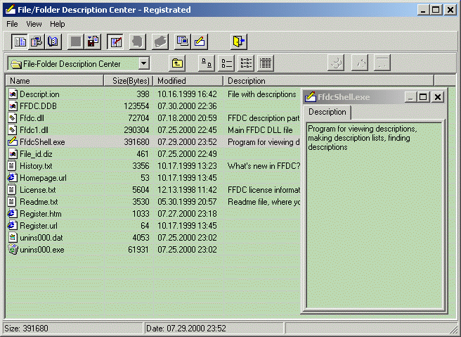 File-Folder Description Center - Version 3.7 Cataloging system that helps you easily view and keep descriptions of Windows'95/98/NT4/2000 folders and files, ZIP and RAR archives, WWW HTM/HTML pages. 4DOS compatible file format: Descript.ion, File_id.diz, Dirinfo. Access to files versions, files attributes. Easy to use: right click on filename in Windows Explorer