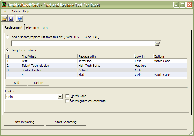 Find and Replace Tool for Excel - Version 2.0 Find and Replace Tool For Excel takes ALL the hard work out of replacing text across multiple Microsoft Excel spreadsheets. Just imagine - next time your organization changes its phone number, address, web site or CEO - just run Find and Replace Tool For Excel across your file server or website to fix all affected spreadsheets in one hit. Features:# No limit on number of Spreadsheets it can process. # All advance options of find and replace which Microsoft Excel offers # Application is using Microsoft Office’s object model which give you speed and accuracy of Microsoft Excel. # Import, export and save list of changes. # It can Save all the options user frequently uses like name of the folder, password of spreadsheets and other options. # Gives a report which after completion of replacing, states how many changes made and on which file and