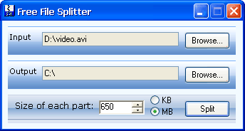 Free File Splitter - Version 1.0 Free File Splitter enables you to easily split large files into smaller ones, and creates a small executable file that can automatically rejoin the parts to recreate the original file. Thus, you can send the smaller parts to anyone, and they can rejoin them without having to use this software (this is especially handy for transferring large files via email).