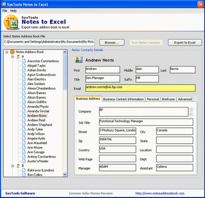 Lotus Notes Address Book to Excel - Version 6.5 Export Notes Address Book to Excel with Lotus NotesAddress Book Excel software at SysTools, in order tocontinue working with the contacts data even when thereis a change in the email client or some corruption inthe system. How to Export Notes Contacts to Excel?Lotus Notes user are often seen stuck in a problem likethis. Because to operate Lotus Notes one needs a goodgrasp over the technical know how, it is then thesoftware for Export Notes Address Book to Excel comeshandy, for the software adds to the credibility of thealready convenient MS Excel, as it saves the names.nsfdata in alphabetical order, which helps with the searchand maintenance of the data. The saving of data in theMS Excel also allows them to be within the reach of thenon-technical users. With help of the Lotus NotesAddress Book Excel utility you can convert the softwareeven if the system displays error message like "You arenot authorized to perform that operation" and theexcellence of the software lies in its ability of notinstalling any threats or viruses. To help you shrugoff any of your apprehension about the working of thesoftware, we provide online the demo version of theLotus Notes Address Book Excel software free of cost.The demo version converts 10 contacts from Names.NSF toExcel, thus providing you a first hand experience aboutthe working of the software. For the access to the bulkconversion the personal license is available for $48and the business license for $129.