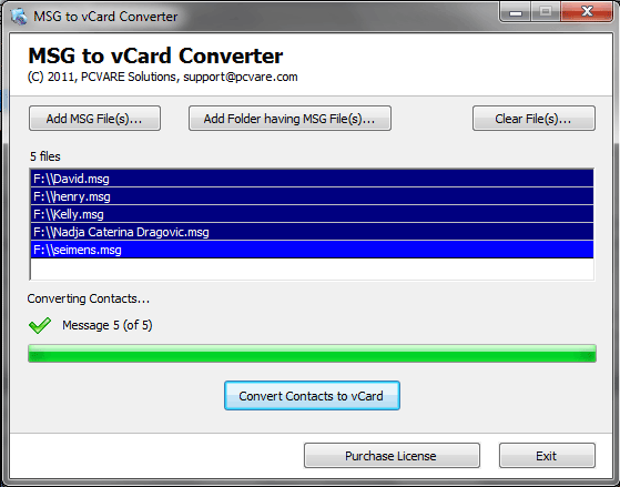 MSG to vCard Converter - Version 3.0 Get the most beneficial MSG to vCard Converter tool developed by PCVARE Inc. to convert batch msg to vcard, convert msg to vcf, convert msg to vcard. MSG to vCard Converter allow its users to convert MSG to vCard with all fields like - first name, last name, middle name, phone number, mobile number, email, address (business & home), photo etc. Using MSG to vCard Converter convert MSG to vCard and you can easily import MSG contacts into Outlook, Lotus Notes, Windows Contacts, Mac Mail, Apple Mail. The new & updated version of MSG to vCard Converter support Batch Conversion option to convert batch MSG to vCard. MSG to vCard Converter helps users to convert batch msg to vcard, convert msg to vcf, convert msg to vcard, export msg to vcard, export msg to vcf in easy steps. MSG to vCard Converter successfully runs on Windows 98, 2002, 2003, XP, Vista, 7.