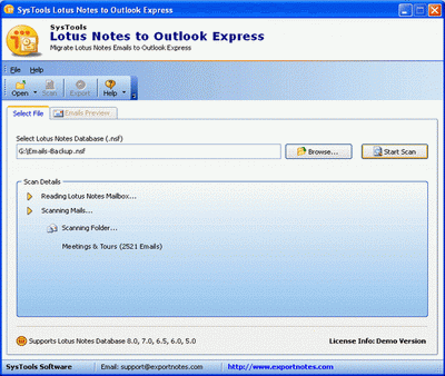 Migrate Lotus Notes to EML format - Version 3.0 Do you think that the migration of Migrate Lotus Notes to EML format mode is not easy for you, our Lotus Notes to EML tool can proved that is easy it can provides you more ease for Convert Lotus Notes Email to Outlook Express. We surly say that after using our Convert Lotus Notes to EML tool your thinking is changed, now you can say that Migration of Lotus in Outlook Express is effortless with Lotus Notes Emails to Outlook Express tool. It Convert NSF to EML v8.5, 8.0, 7.0, 6.5 & 5.0 to Outlook Express v6.5, 6.0, 5.0, 4.01 & 4.0. NSF to EML program productively runs with Windows 98, 2000, XP, 2003, Vista & 7. If you want to see how it works then you can visit our website & download trial version of Lotus Notes to Outlook Express software. Its convert first 15 mails per folder from Lotus Notes to EML format Emails. After evaluating demo if you get result according to your aspiration, then you can purchase full personal license paying just $190 & $399 for business uses. If you are feeling any circumstance while using our software you can contact us any time.