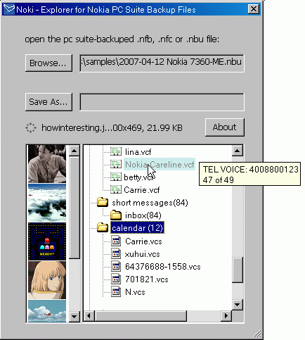 Noki - Version 1.4 Noki - Explore and extract SMS, phone book, Calendar, Memo and other user files from the backup file of Nokia phone (using Nokia PC Suite). Looking for a better way to manage your backup file from Nokia PC Suite? Trying to view the content of the .nbu, .nfb or .nfc file? Having many SMS and phone book entries in the phone but don't know how to archiving them? Noki gives you fully control of the backuped content. It's simple and easy to explore and extract phone book, SMS, calendar, memo, photos, wallpapers, music and other files in the backup file just like it's done in Windows file and directory. You can choose to convert phone book, sms, calendar or memo to text format, remain the orginal format or merge into one text, excel .xls or html file. You can preview photos and pictures in thumbnails or view the interested item in tool tip. visit at: http://nokisms.googlepages.com