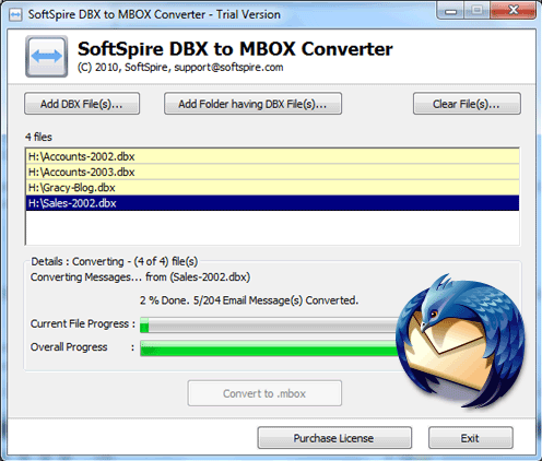 Outlook Express to Thunderbird - Version 2.1 Convert Outlook Express to Thunderbird in batch conversion mode to convert multiple dbx files to thunderbird at single Outlook Express to Thunderbird conversion round or batch. Convert dbx to thunderbird in just a single click including all its email properties - attachments, formatting, meta data (to, cc, bcc, date, subjects), read/unread status of emails. Convert DBX files to MBOX and then try importing mbox files to thunderbird then you can easily import & converts emails of Outlook express to Thunderbird. Converting DBX to thunder bird is easy with DBX to Thunderbird converter. You can also convert Outlook express to Apple Mac Mail, entourage, evolution, eudora email programs. Download demo of DBX to Thunderbird converter to try the process to convert DBX to thunderbird. Demo only converts 5 emails from each dbx files to thunderbird. Purchase the licensed edition from: http://www.softspire.com/outlook-express-to-thunderbird.html to convert unlimited DBX files to Thunderbird. Outlook Express to Thunderbird converter has been rated as fastest & best email conversion to