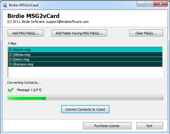 Outlook MSG to VCF Converter - Version 2.4 The migration job of Outlook msg contact files into vCard format now becomes easier by the means of Outlook msg to vcf converter program straightway. This program completely supports to convert msg contact files into vCard format along with entire contact details such; name, address, contact photo, website and other data in accurate way. By using our Outlook msg to vcf converter program users can also perform the job batch conversion o Outlook msg contact to vcf at single time without any difficulty. Our Outlook msg to vcard converter program also comes in demo edition, which is completely free of cost. Once satisfied with the working demo get the licensed edition of Birdie MSG to vCard Converter for complete conversion of MSG contacts into vCard file, this cost you about 49 USD only.