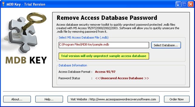 Remove Access Security - Version 1.6.3 Know how to remove access security from Access database easily with Access Security remover tool. Download & Try Ms Access Security remover tool by Migra Software that removes access security from password protected MS Access database. Unprotect Access database, unlock mdb file & unsecure Access database with Access Security Remover tool. MS Access database security remover tool of Migra Software has easy and user friendly interface which help users to remove access database security quickly. MDB Key supports and removes mdb password from access database created using MS Access 2007/2003/2002/2000/97. MDB Key tool removes multilingual, lengthy and complex password from MDB database. Now remove mdb security in just 2 clicks of mouse with MDB Key. MS Access must be installed in order to remove Access database security using MDB Key. To unsecure access databases try using "MDB Key" - Access security remove tool which allow you to unprotect mdb database and enable users to unsecure mdb files instantly. Download Trial version of MDB Key which will help you to remove mdb
