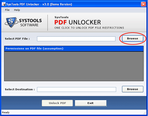 Remove PDF Security - Version 3.0 Remove PDF security or to remove Adobe security settings from locked PDF filed easily with PDF security remover program. SysTools for PDF Unlocker tool is a reliable and affordable solution to remove security from a PDF file and to remove eBook security settings without any data risk. PDF document restrictions remover tool allows users to copy content from PDF file, enable PDF print option, enable PDF edit option and allow extracting form PDF files. If you have bulk PDF files or documents which are protected with owner password, don't panic because SysTools PDF Unlocker helps you to break PDF security or to remove owner password from locked PDF files. Software supports almost all Adobe Acrobat versions (up to 9, even with 128-bit or 256-bit encryption). FREE demo version of PDF Unlocker tool can remove PDF protection from sample PDF files, provided with software setup. To security from unlimited PDF files, get full retail version PDF Unlocker tool at just only 49 dollars.