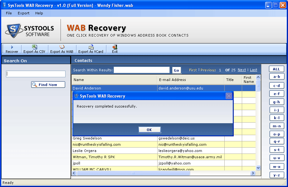 Repair OE WAB File - Version 1.0 OE Address Book Recovery is making Outlook Express it accepts data from OST file and transfer into Outlook PST file. Suppose your WAB file become corrupt and deleted you will not be able to access your important contacts like emails address, address, first name, last name, phone number etc. Then you can use to Outlook Express Contacts Repair software for recover deleted & corrupted email address from Outlook Express WAB file. WAB file Restore software is easy to restore your all emails address from Outlook Express WAB file. Download SysTools WAB recovery software and follow few easy steps to recover delete and corrupted contacts from Outlook Express WAB file. But before using this software Outlook Express installed your PC. Read WAB file software successfully runs on Windows95, 98, ME, NT, 2000, XP, 2003/windows7. WAB file Reader successfully support Outlook Express version 5.0, 6.0 and above. For trial download demo version of SysTools WAB recovery software at free of cost. You can only recover WAB file but cannot save address. To save contacts you have to purchase full version of WAB