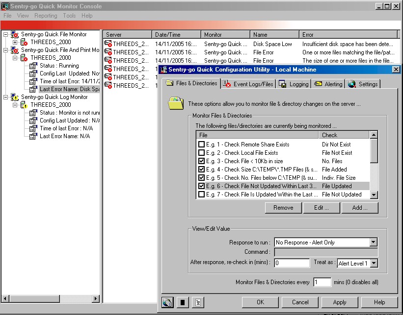 Sentry-go Quick File Monitor - Version 4.5 Monitor the availability of local or remote files or directories, File or directory size or file count. Monitor for changes to the underlying directory structure - new files being added to or files being removed from a directory or subdirectories. Monitor messages written to the Windows Event Logs based on error type, event ID, source or keywords & phrases within the text. On an alertrespond automatically by running a command or application.
