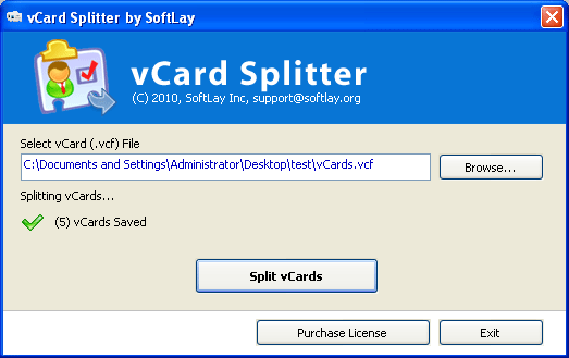 SoftLay vCard Splitter - Version 3.0 Get SoftLay vCard Splitter to split multiple vcf file in bulk or you can split vCard address book from single vcf to multiple vcf files. You can do split vcf download online from SoftLay website and then you can split contacts from vCard by this vCard Splitter. From website when you will download demo version of vCard Splitter then you can make a try to split 5 contacts from standard .vcf file because demo only supports to split 5 vCard files to split multiple vCard files you should go for full license version of SoftLay vCard Splitter. SoftLay vCard Splitter is able to split any vCard file of any version, and this vCard splitter tool will remain all your vCard contacts properties like: First name, last name, email address, phone no, mobile no, images, website etc. and SoftLay vCard Splitter is compatible with all Windows version: 98, 2000, 2002 (XP), 2003, Vista, and Win 7 (32 and 64 bit). Use vCard Splitter to split vCard file 3.0 & vCard file 2.1 in sufficient manner. Why are you wasting your time, split vCard files manually? Just try an ultimate solution to split vCard files