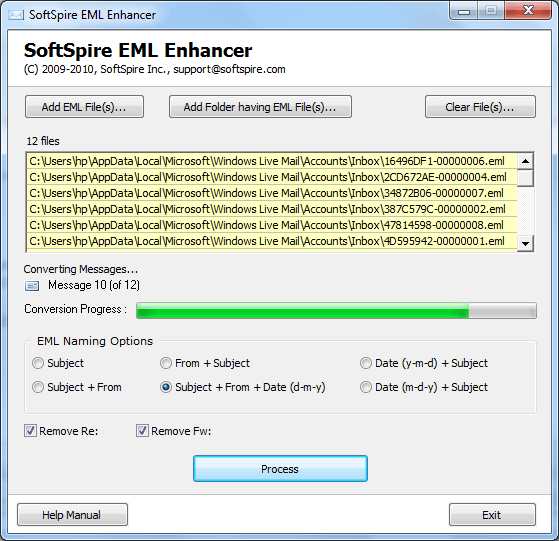 SoftSpire EML Enhancer - Version 1.2 Are you unable to Find a particular EML File in Windows Live Mail ? Give a try to EML Enhancer tool that rename EML files having file names that is difficult to understand & locate. EML Enhancer is a widely used to EML Rename software to rename EML files in bulk. You can rename unlimited EML files in one go using EML Enhancer. With EML Enhancer tool users can locate, find, archive, manage EML files very conveniently as this tool help in renaming EML files in bulk. EML Enhancer Software is a specialized application to rename alphanumeric eml files with detailed file names. Software provides following EML Naming options to rename emails of Windows Live Mail:* Subject* From+ Subject* Date (yy-mm-dd) + Subject* Subject + From* Subject + From + Date (dd-mm-yy)* Date (mm-dd-yy) + SubjectEML Enhancer help s users to enhance the EMLfile names in instant steps. EML Enhancer picks up information