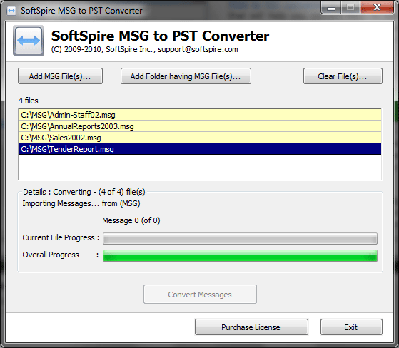 SoftSpire MSG to PST Converter - Version 2.1 Get the MSG to PST Converter Software to facilitate the process of conversion of MSG files to Outlook PST file. If you are having thousand of emails stored in your disk in MSG format, the best option left to you is to save those MSG files in MS Outlook as PST File so as to manage daily tasks, schedule business meetings and personal appointments, keep notes, store thousands of contacts - in other words, it provides everything you would possibly need to manage your time and communicate with business partners and friends. MSG to PST Converter program is intended to convert MSG to PST. The program enable users to convert .msg (Outlook messages) to .pst so that users can easily read & save their orphan Outlook messages to Outlook PST file. Convert MSG files to PST files in just 3 clicks with SoftSpire MSG to PST Converter. For its ability to enable the user to view MSG emails in MS Outlook, this MSG to PST conversion tool is perfect for forensic mail archiving of Outlook emails. MSG to PST converter program is a perfect solution to creating archives of MSG Emails inside the Microsoft