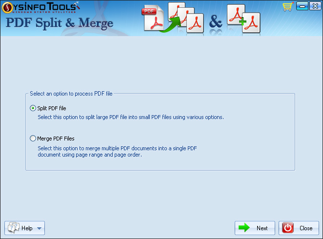 SysInfoTools PDF Split and Merge - Version 2.0 PDF Split and Merge tool from SysInfoTools is a highly advance, non-destructive, lightweight, cost effective PDF manager tool that enable user to merge any number of PDF file into single PDF file and at the same time it also allow user to split the single PDF file into numbers of PDF files. With PDF Split and Merge tool from SysInfoTools, you can merge PDF files based on page numbers, range, group wise, odd and even page numbers. Similar features are also supported when you split the PDF files.Now a day's, PDF files are one of the most reliable medium for information sharing, when dealing with PDF files many times you consider different PDF files some files may contain small number of pages and other may contain thousands of pages, sometimes you need to merge many PDF files and sometimes you need to split the file containing thousands of pages for efficient information handling. In such situations it becomes a nightmare to handle PDF files if you don't have any PDF management tool. To overcome all these situations