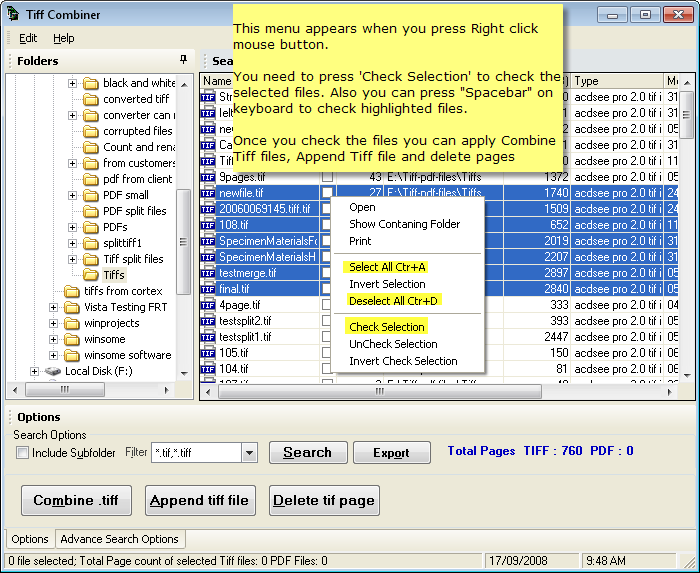 Tiff Combiner - Version 3.0 TIFF Combiner is unique tool to combine several single and multi-page tiff files into one multi-page tiff file. Tiff combiner has easy to use interface to combine tiff files. It has fast tiff file search facility to facilitate your work. We have design Tiff combiner considering Fast and error free combining of your tiff files. It supports all versions of tiff files. It also supports tiff files which are compressed. Download Tiff combiner and test powerful performance of Tiff combiner. It also has inbuilt Tiff file search. • A simple, flexible and powerful interface.• Supports Compressed Tiff Files.• Fast and Error Free Combining of Tiff Files.• Choose Different Naming Conventions of New Tiff Files• You can set order of new combine all merged file.• Append tiff file to many tiff files in one time.• Delete and Add or Insert any page from Tiff file in batch mode.