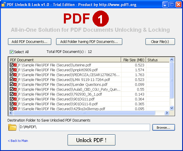 Unlock Adobe PDF document - Version 2.0 Are you looking for a software to unlock adobe PDF document and break free the PDF files from all the restrictions? Get PDF Unlock Software to unlock adobe PDF document to allow copying, editing, modifying, extracting, and printing permissions. Use the batch mode feature of the PDF Unlocker to unlock multiple PDF files in single attempt. The software provides simple and easy steps to all the users to effortlessly unlock Adobe PDF file. The PDF Unlock software supports to unlock adobe PDF document with accurate formatting like (fonts, text styles, hyperlinks, images, signatures, colors, etc). The software is an easy to use program that perfectly unlock adobe PDF document and once all the protections are unlocked, generates a new PDF file. The software is a perfect tool that lets users decrypt owner password and unlock adobe PDF document any time. This software supports to unlock all PDF files created in PDF 1.1 to 1.5, including RC 4 decryption (40-bit &128-bit) and also supports all Adobe Reader versions 9. You can also lock PDF files using the same PDF Unlocker software.