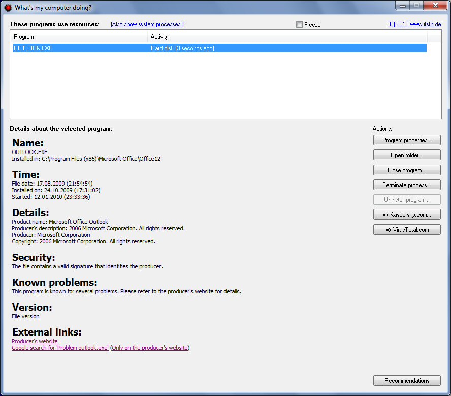 Whats my computer doing? - Version 1.00 What's your PC doing right now? Why is the hard-disk LED burning? Why is the cpu fan running? This freeware app will tell you which program is responsible and helps you with the analysis. Indispensable for analyzing strange hard disk activity or high cpu usage without visible reason.