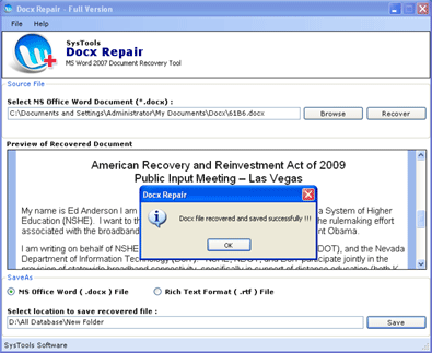 Word 2007 Document Restore - Version 3.2 Data lose problem always bother you! If you success to find out the right solution at the right time, you can cover up your all lost data. Lots of recovery software is available in the market but few of them give you the accurate result. Accuracy is the main concern while we are talking about recovery of any data. As we all know that MS Word latest version MS Word 2007 has launched with its new and exiting features. MS Word 2007 provides frequently used tools, commands and style. The latest version of Word 2007 file supports Docx extension file. If you are using word 2007, then your entire data information store in Docx file because the word 2007 file extension. If your Docx files got damaged or corrupted due to some uninvited and unavoidable reasons like Virus attack, system crash, hardware failure etc. and you worry about your corrupt data, SysTools Docx repair helps you to restore your corrupt data with accuracy. Restore Word File Content Tool is easy to install and secure your Docx data with its advance utility. SysTools Docx Repair Software provides you Word File Data
