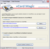 vCard to Outlook - Version 2.0 :- If you are searching for vCard to Outlook converter, then your searching is finished here. PCVITA vCard Magic software is perfect software for easy convert vCard to Outlook contacts. Software vCard to Outlook is capable to convert all the components of your vCard into Outlook like name, address, email and images etc. Our vCard to Outlook converter safe you from manually process to convert vCard to Outlook and helps you to convert any number of contacts from vCard to Outlook. vCard to Outlook converter build on future advance technique and easily support vCard 2.1 and 3.0 versions. With the help of PCVITA vCard Magic you can easily convert vCard to the entire Microsoft Outlook version-- vCard to Outlook 2000- vCard to Outlook 2003 - vCard to Outlook 2007- vCard to Outlook 2010. PCVITA vCard Magic software provide free demo version, which helps to user for easily judgment about our