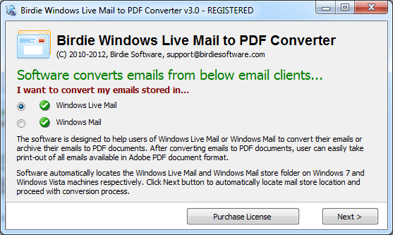 Birdie Windows Live Mail to PDF Converter - Version 3.0 Have you planned to convert mails from Windows Live Mail to PDF format? Then try Birdie Windows Live Mail to PDF Converter program that easily permits you to convert Windows Live Mail to PDF by automatically locating email store folder location of Windows Live Mail. Birdie Windows Live Mail to PDF Converter is a feature-rich tool as it offers different file naming options to save converted .PDF files like - from + subject + date (dd-mm-yyyy), date (yyyy-mm-dd) + from + subject also offer two different attachment saving options like - you can save attachments in embed or in other seperate folder too. Our WLM to PDF Converter tool also works as batch email converter to convert mass of emails from Windows Live Mail to Adobe PDF file at single conversion cycle. So try the free-demo now to judge the complete product after that go for the license edition of Birdie Windows Live Mail to PDF Converter to convert Windows Live Mail or Windows Mail to PDF file as well (Supports Both Email Client - One Solution for Multiple Reasons) with unlimited emails at single time.
