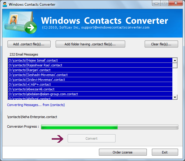 Contact to Outlook - Version 3.0 I have a bunch of Windows Vista Contact files (*.contact) that I want converted into a standard contact file (*.csv or *.vcf). Anyone knows a program that can do that? Yes we have software named Contact to Outlook Converter which can do safe migration of windows .contact to outlook contacts. Windows Live Mail and Windows vista supports to use .contact files to store information but there may be some situation where user wants to store in outlook, outlook express, thunderbird, Mac mail, Eudora. In that situation SoftLay Contact to Outlook Converter can help the users as this utility can easily move the entire items from windows vista and windows 7 to Outlook 2003, 2007 and 2010. Software has the ability to import .contact to outlook in bulk. Software 100% help you to import .contact to outlook smoothly and also it supports to convert .contact to VCF and CSV file also. Use SoftLay Contact to Outlook converter to convert .Contact files with all contact information such as summary, name, email, address, family, notes, home, work etc which can easily open in any version of