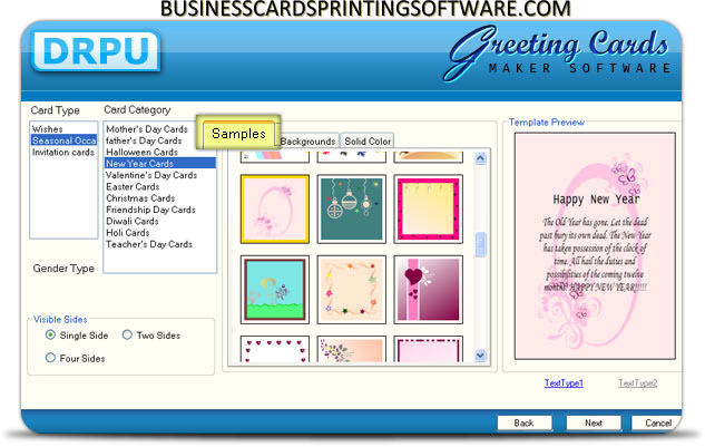 Greeting Cards Designing Software - Version 8.2.0.1 User friendly and efficient greeting card makerapplication is available at company websitewww.businesscardsprintingsoftware.com URL to createpersonalized greeting card by using designing programincluding arc, rectangle, ellipse, triangle, text,picture, star object, pencil etc. Greeting CardsDesigning Software is used for creating multiplegreeting card with different text values foranniversary, wedding, birthday, mother�s day or otheroccasions.