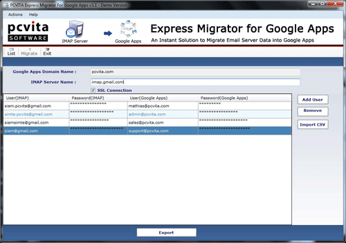 PCVITA IMAP Server to Google Apps - Version 3.1 IMAP (Instant Message Access Protocol) is an internet protocol for using retrieval email from any webmail server like Gmail, Yahoo Mail, Rediff Mail, MSN Hot Mail, Windows Live Mail etc. If you need to migrate IMAP server to Google Apps then PCVITA IMAP Server to Google Apps Migration tool is excellent choice to transfer entire IMAP Server data to Google Apps. By using this tool you can perform bulk IMAP Server to Google Apps migrations without any data loss errors. Get trail version to evaluate the software functionality. With free demo tool you can migrate 15 IMAP server emails to Google Apps. To perform bulk IMAP server to Google Apps you need to buy full license key of PCVITA IMAP Server to Google Apps Migration tool. Acquire the full version which have starting price at $69 only. For further assistance you can easily contacts to our 24x7 technical support team.