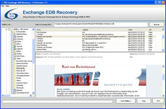 EDB to PST - Version 3.2 Do you want to repair corrupt EDB file? So quickly visit at PDS site and get PDS EDB to PST software. This is superb EDB to PST converter software which quickly works on your corrupt EDB file and repair corrupt EDB file. PDS Exchange EDB to PST converter software smoothly export priv1.EDB to PST with original coding- TXT, RTF, HTML. Through Exchange EDB to PST recovery software you can smoothly recover data EDB to PST along with every email meta data-To, Cc, Bcc, Subject, Date, and Time. PDS EDB to PST conversion software smoothly convert exchange EDB to PST with whole EDB folders items- Inbox, Outbox, Sent Items, Deleted Items, Draft, Journals, Tasks, Calendars, Notes, and Contacts as well as it open exchange EDB file in outlook file. PDS EDB to PST software successfully import EDB to PST. It works on all EDB file versions-5.0/5.5/2000/2003/2007 and 2010.There are some features of EDB to PST Converter software* Quickly repair corrupt EDB file and Open Exchange EDB file into outlook