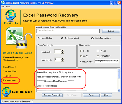 Excel Unlocker Freeware - Version 2.0 If you can't open your excel file because you have lost, forgot your excel file password so don't get nerves just try Enstella excel unlocker freeware software which is a fabulous tool with nice quality. It just break excel file password free and also remove excel file security in right way. Excel file password cracker tool efficiently break any kind of password and security wheather your password belongs to numeric term or alpha numeric values. Enstella excel unlocker free program really helps you to recover excel file password with full previous internal data. This excel unlocker freeware software deeply recover first 3 character of your lost excel sheet password. Superb excel file password cracker freeware software easily break excel file password free by applying two unique method Dictionary Attack, Brute force attack and you can purely get back your excel file password using it. Some key feature of excel unlocker freeware software * Fastly recover excel file password free.