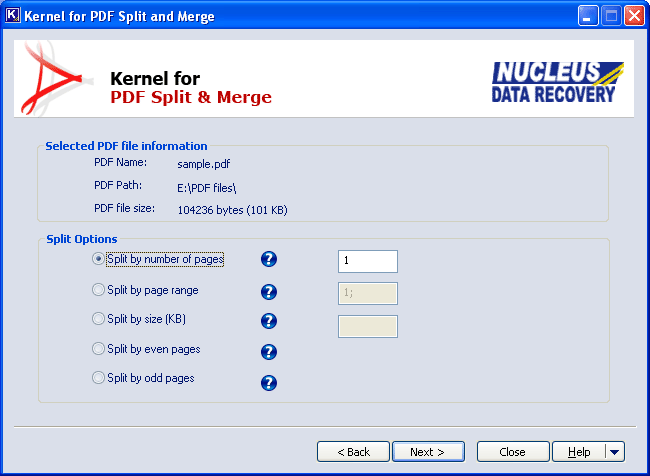 Online PDF Splitter - Version 10.05.01 This online PDF splitter tool has the ability to splitPDF files based on different parameters such as splitby page, by page range, by size, by even pages, and byodd pages. This online PDF splitter tool has theability to prioritize the merge process. This onlinePDF splitter tool supports all versions of AdobeAcrobat reader. Using this PDF splitter tool, you can add a completefolder for the merging process. Also, this PDF splittertool offers ease in managing PDF documents.Kernel for PDF Split and Merge comes with a freeevaluation version. This free evaluation version solvesyour two purposes. First is that this free evaluationversion enables you to split and merge PDF files andsecond benefit is that you are able to analyze thevarious features, capabilities, as well as performanceof the tool. This free evaluation version has onelimitation and that is it displays a diagonal stamp inred color saying “Kernel for PDF Split and Merge Demo”. This online PDF splitter tool enables both nontechnical as well as professional users to easily workon the tool as the tool comes with an absolutelyinteractive, intuitive, and self-descriptive graphicaluser interface.