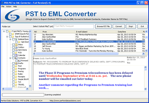 PST to EML Converter - Version 5.4 Advance PST to EML Conversion software is one of the best and effective MS Outlook Email export tool to easily export PST Emails to EML format. Perfect Data Solutions offers best PST to EML Converter techniques to export PST Emails to Outlook Express and Thunderbird email client with affordable price. Our advanced PST to EML Conversion utility fastly scans PST emails and extract PST file and convert PST to EML file format. After complete Outlook PST to EML conversion process, software gives you the separate EML files and then you can easily import all converted EML files to Outlook Express and Thunderbird email client using drag and drop method. Professional PST to EML Converter software perfectly convert PST to EML with all PST emails, email attachment, all email properties like To, Cc, Bcc, Sent/Receive Date and Time in few simple easy steps. Best Outlook to Outlook Express email converter specially designed for migrating pst mailbox to outlook express and thunderbird email client. PDS PST to EML migrate tool fully capable to migrate PST to EML file with simple